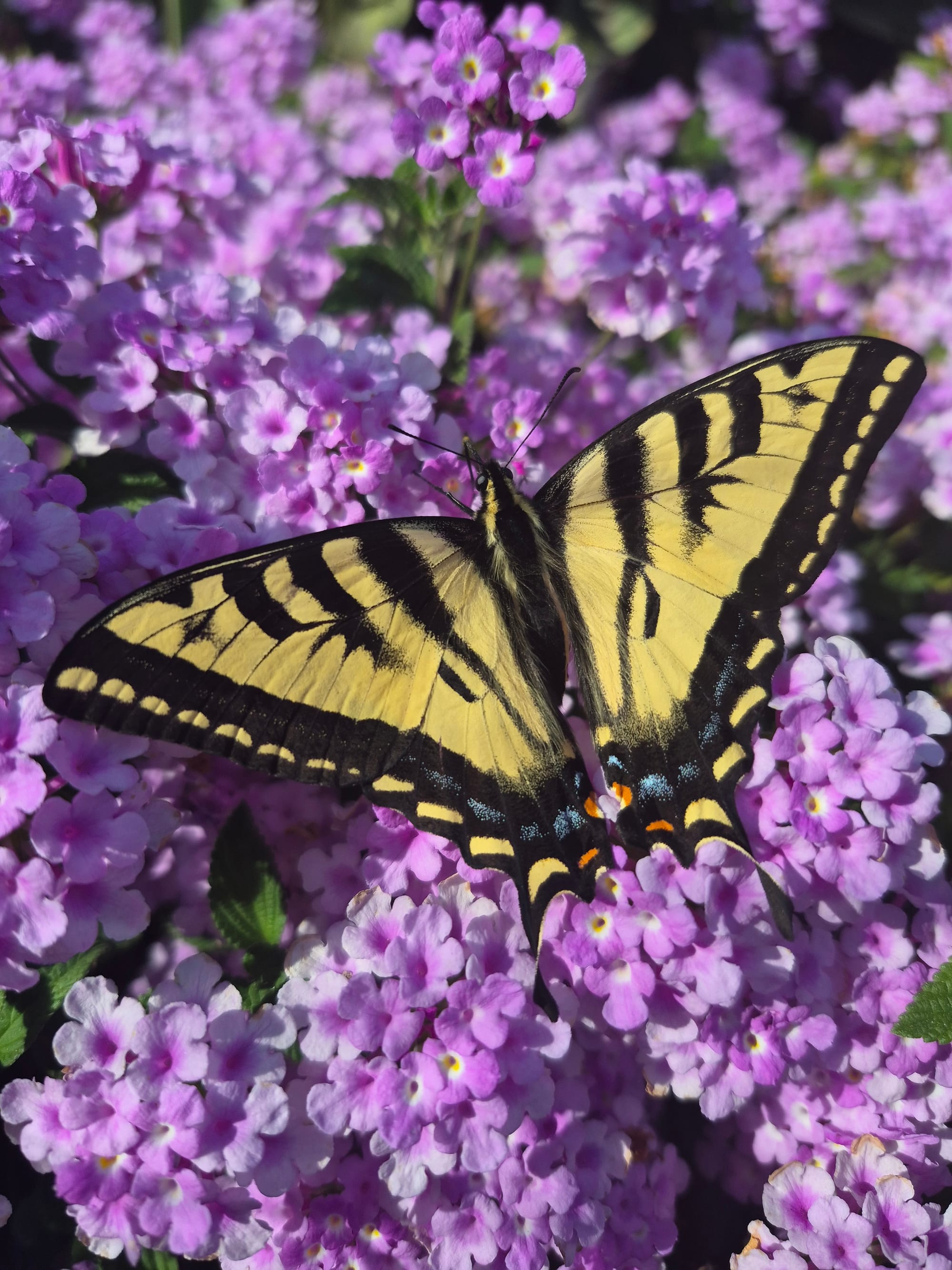 Eastern Tiger Swallowtail (Papilio glaucus) β Bakersfield, California Field Assessment: β β β β β Clean wing spread with strong yellow-black contrast against purple lantana flowers. Good symmetry and subject separation with pleasing natural color. Slight shadow across the body but overall, a strong field capture showing the butterfly feeding among blooms.